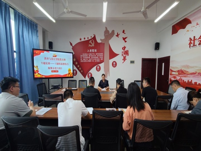6月16日,教育与设计学院党支部于SJ1505党团活动室开展学习贯彻习近平新时代中国特色社会主义思想主题教育专题党课。学院全体党员聆听党课。